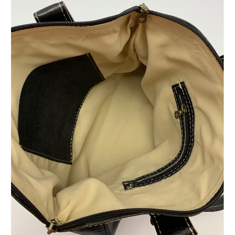 Dámská kožená kabelka z jemné kůže se středně dlouhýma dvěma ušima přidělanými na přezky, takže je možno mírně korigovat délku uší (max. délka 27). Kabelka má zajímavě zakomponované uchycení uší na přezky. Z přední strany má kabelka dvě menší kapsičky, kdy jedna z nich je ozdobena propletenou kůží. Uvnitř má kabelka podšívku, malou kapsičku na zip a kapsičku na mobilní telefon. Je to velice krásná a elegantní kabelka, která doplní Váš šatník pro všechny příležitosti. Kůže na kabelku je ručně barvená a kabelka ručně šitá.