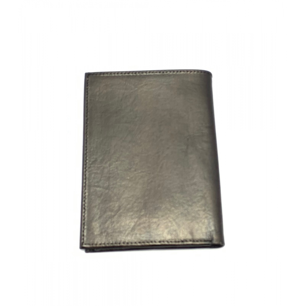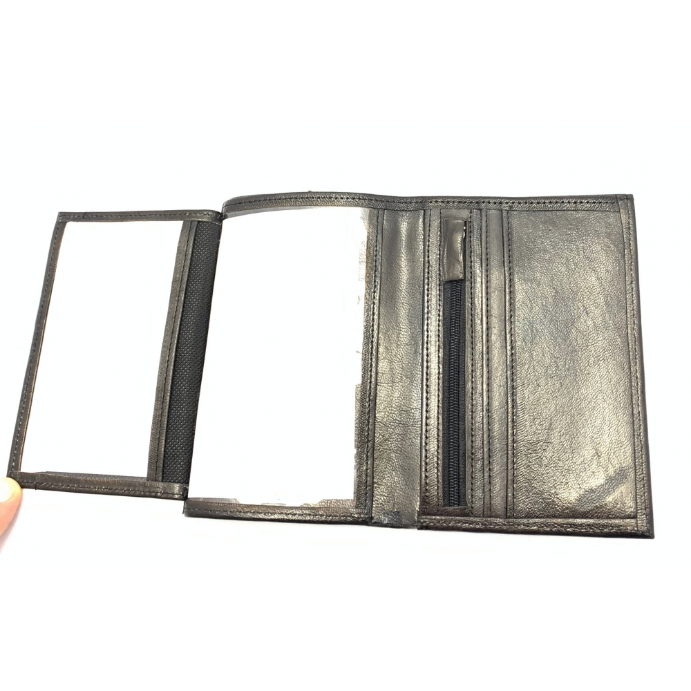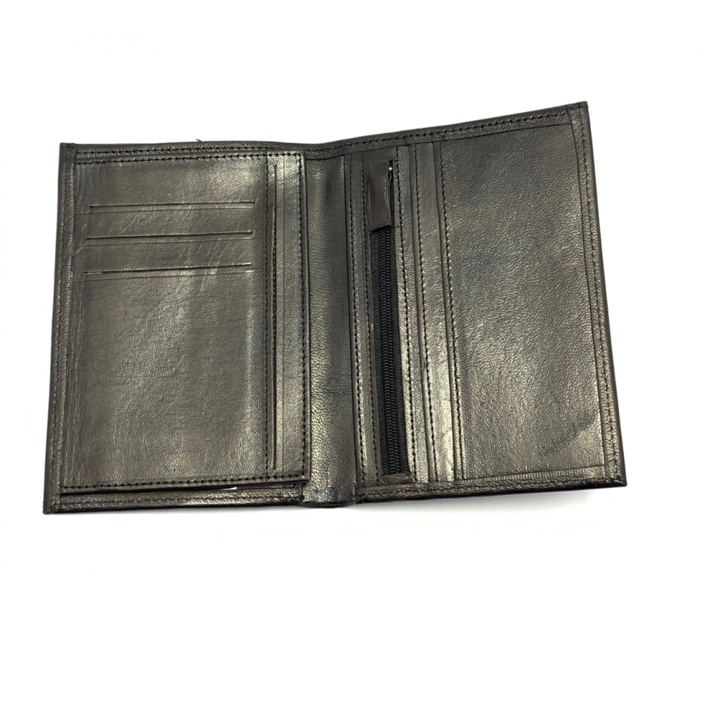 Kožená pánská peněženka, která má po rozevření místo na drobné mince (přihrádka na zip), místo na karty a vizitky, dále se peněženka na levé straně rozevře a je zde místo na doklady. Místo na papírové peníze je z vrchu.