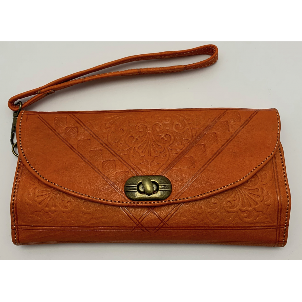 Dámská kožená peněženka velká zapínací na otočný knoflík. Peněženka se celá rozevře, má přihrádky na karty, kapsu na drobné mince zavírací na zip, přihrádku na peníze a velkou přihrádku po celé délce peněženky. Peněženka je v rozevřeném stavu velká 21 cm, zavřená 12 cm.
