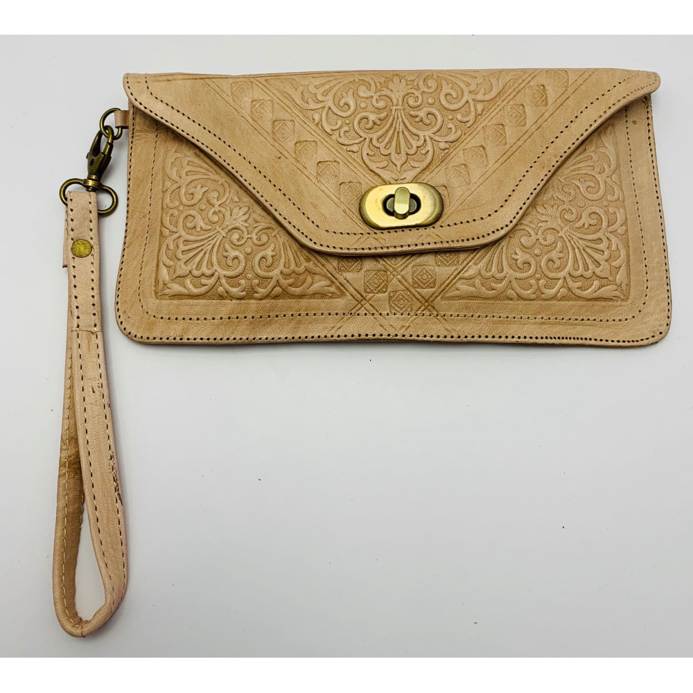 Dámská kožená malá kabelka do ruky, tzn. psaníčko. Kabelka je z příjemné měkké kůže ručně šitá, po celé přední části má mačkaný vzor. Přes celou délku zadní části kabelky z venkovní části je kapsa na zip. Kabelka je zavírací na ozdobný otočný knoflík. Kabelku můžete nosit buď navlečenou na ruce na poutku nebo můžete poutko odepnout a nosit jako tzv. psaníčko v ruce. Uvnitř je kapsa na zip a kapsa na Vaše doklady a cennosti. Kabelku můžete také použít jako tzv. dokladovku a dát si do ní svoje cennosti a vložit do svojí kabelky. Určitě bude krásným modním doplňkem, pokud se pro ní rozhodnete.